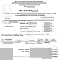 - Основная часть – в ней пишется название обучающей программы, какое количество времени было выделено на обучение, а также заносятся данные протокола заседания комиссии.